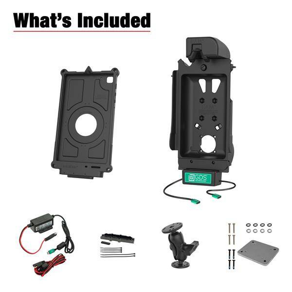 - Комплект включает в себя GDS® Tough-Dock™, IntelliSkin® Next Gen для Samsung Tab A7 Lite 8.7", модульное зарядное устройство GDS® 10-30V Hardwire Charger, двойное шаровое крепление C Size с коротким рычагом, адаптер задней панели и зажим для кабеля.