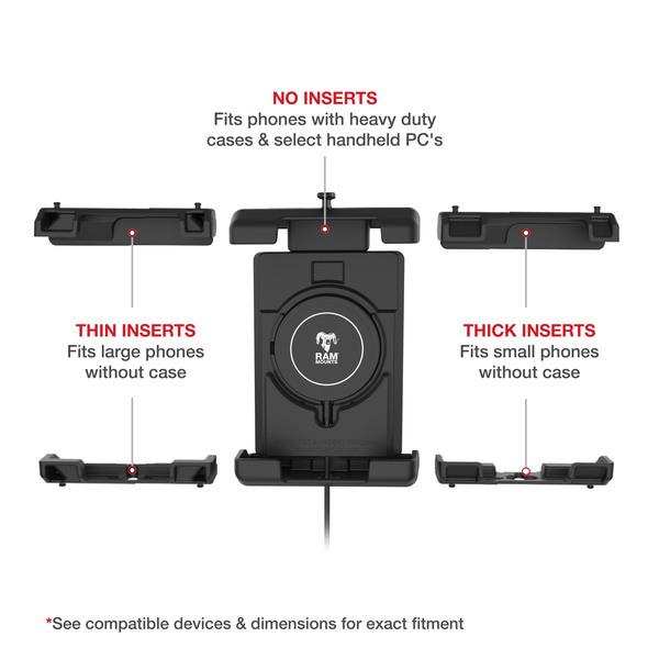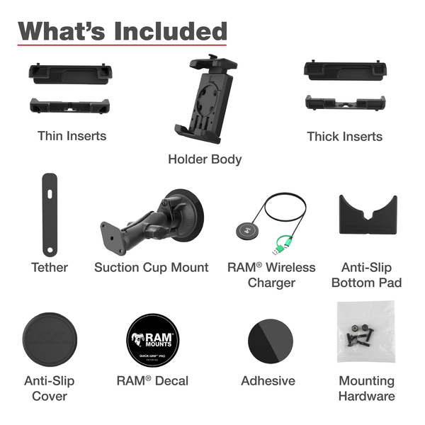 RAM Quick-Grip Pro XL Suction Cup Mount with Qi2 15W Wireless Charger (RAM-B-166-PD7-W2MU) - это следующая эволюция серии RAM Quick-Grip, переработанная в самый прочный универсальный держатель для телефонов, который подходит для широкого спектра телефонов и карманных устройств. Этот держатель телефона поставляется с беспроводным зарядным устройством RAM Qi2 и имеет встроенную полость для его фиксации на месте. Держатель телефона оснащен противоскользящей накладкой, обеспечивающей плотное прилегание, когда шайба беспроводной зарядки не установлена. RAM Quick-Grip Pro XL имеет подпружиненную конструкцию, которая позволяет легко вставлять и вынимать устройство одной рукой. В комплект входят большие и маленькие прокладки, обеспечивающие плотное и надежное прилегание больших и маленьких телефонов без чехла. В комплект входит основание RAM Twist-Lock с присоской диаметром 3,3 дюйма, которое легко устанавливается на любую непористую поверхность. RAM рекомендует устанавливать прилагаемую привязь для устройства, если этот держатель используется в автомобиле с открытой кабиной. При определении габаритных размеров важно проверить размеры вашего портативного устройства вместе с чехлом, футляром или кожей. БрендСимволRAM-B-166-PD7-W2MUКод производителя793442026768НовыйДаОборудование включеноAssembly HardwareРазмеры рукояткиHeight Range: 5.375" - 7"|Width Range: 2.75" - 3.5"|Max Depth: .75"Размер всасыванияДиаметр 3,3"Длина от розетки до розетки3"Размер шараРазмер B (1")ЕмкостьСтандартное использование: 907,18 грамм|Твердое использование: 453,59 граммМатериалыАлюминий, морской классВысокопрочный композитТип упаковкиПластиковый пакетТехнические характеристики источника питанияOperating Frequency: 360KHZ|Stand-by Consumption ~ 0.008A / 8mA @5VDC|80% Wireless Power Transfer Efficiency or Greater|Supports USB 2.0 BC1.2 Power Supply (5V)|Supports Qualcomm QC 2.0, QC 2.0, USB PD 2.0Входное напряжениеUSB 5V @ 3A|QC2.0 9V @ 2.22A|USB PD 2.0 5-15V @ 2AВыходная мощностьBPP - 5W|EPP - 7.5W|MPP - 15WВыходной разъемUSB Type-C Male with USB-A AdapterДлина выходного кабеля1 метрOperating Temperature0°C to +40°CТемпература хранения-от 20°C до +80°CНормативные документыOver Current Protection|Short Cirtcuit Protection|Over Temperature Protection|RoHS Compliance|WEEE ComplianceСертификатыIP67|SAE J1455|FCC Certification|CE Certification|E-Mark Certification|RCM CertificationКомпонентыRAM-B-166URAM-GDS-CHARGE-W2MRAM-HOL-PD7UСовместимостьApple iPhone 11Apple iPhone 11 ProApple iPhone 11 Pro MaxApple iPhone 12Apple iPhone 12 ProApple iPhone 12 Pro MaxApple iPhone 13Apple iPhone 13 ProApple iPhone 13 Pro MaxApple iPhone 14Apple iPhone 14 PlusApple iPhone 14 ProApple iPhone 14 Pro MaxApple iPhone 15Apple iPhone 15 PlusApple iPhone 15 ProApple iPhone 15 Pro MaxApple iPhone 16Apple iPhone 16 PlusApple iPhone 16 ProApple iPhone 16 Pro MaxApple iPhone 16eApple iPhone 17Apple iPhone 17 ProApple iPhone 17 Pro MaxApple iPhone AirApple iPhone 8Apple iPhone 8 PlusApple iPhone SEApple iPhone XApple iPhone XrApple iPhone XsApple iPhone Xs MaxBlackberry Evolve XGoogle Pixel 3Google Pixel 3 XLGoogle Pixel 4Google Pixel 4 XLGoogle Pixel 5Google Pixel 6Google Pixel 6 ProGoogle Pixel 7Google Pixel 7 ProGoogle Pixel 8Google Pixel 8 ProGoogle Pixel 9Google Pixel 9 ProGoogle Pixel 9 Pro XLGoogle Pixel 9aHuawei Mate 20 ProHuawei P30 ProLG G6LG G6 PlusLG G7 ThinQLG G8 ThinQLG G8S ThinQLG V30LG V35 ThinQLG V40 ThinQLG V50 ThinQNokia 8 SiroccoNokia 9 PureViewPanasonic Eluga X1 ProRazer Phone 2Samsung Galaxy Note 10Samsung Galaxy Note 10 PlusSamsung Galaxy Note 20Samsung Galaxy Note 20 UltraSamsung Galaxy Note 8Samsung Galaxy Note 9Samsung Galaxy S10Samsung Galaxy S10 5GSamsung Galaxy S10 PlusSamsung Galaxy S10eSamsung Galaxy S20 5GSamsung Galaxy S20 FE 5GSamsung Galaxy S20 Plus 5GSamsung Galaxy S20 Ultra 5GSamsung Galaxy S21 5GSamsung Galaxy S21 Plus 5GSamsung Galaxy S21 Ultra 5GSamsung Galaxy S22 5GSamsung Galaxy S22 Plus 5GSamsung Galaxy S22 Ultra 5GSamsung Galaxy S23Samsung Galaxy S23 PlusSamsung Galaxy S23 UltraSamsung Galaxy S24Samsung Galaxy S24 PlusSamsung Galaxy S24 UltraSamsung Galaxy S25Samsung Galaxy S25 PlusSamsung Galaxy S25 UltraSamsung Galaxy S8Samsung Galaxy S8 ActiveSamsung Galaxy S8 PlusSamsung Galaxy S9Samsung Galaxy S9 PlusSony Xperia XZ2Sony Xperia XZ3Xiaomi Mi 9Xiaomi Mi 9 ExplorerXiaomi Mi Mix 2SXiaomi Mi Mix 3Характеристика товараSpring-loaded holder provides a secure hold for phones and handheld devices; easily insert and remove your phone with one handВ комплект входит основание с присоской RAM® Twist-Lock™, идеальн