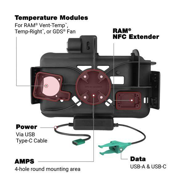 - Совместим с большинством аксессуаров для доков RAM®, включая аксессуары для контроля температуры, RAM® NFC Extender, GDS® Roto-Mag™ и боковые аксессуары.