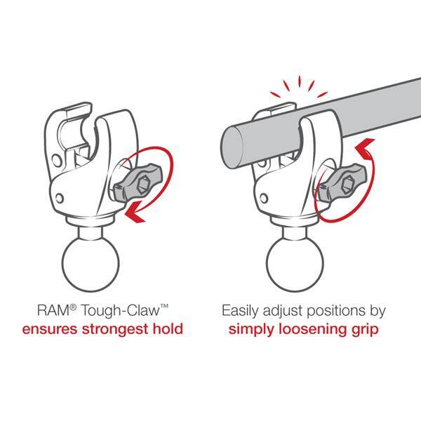 - Малая версия основания RAM® Tough-Claw™ предназначена для быстрого крепления к круглым, квадратным и нестандартным рельсам и брусьям с наружным диаметром от .625" - 1,14"; резиновые накладки обеспечивают надежный захват и защищают монтажную поверхность