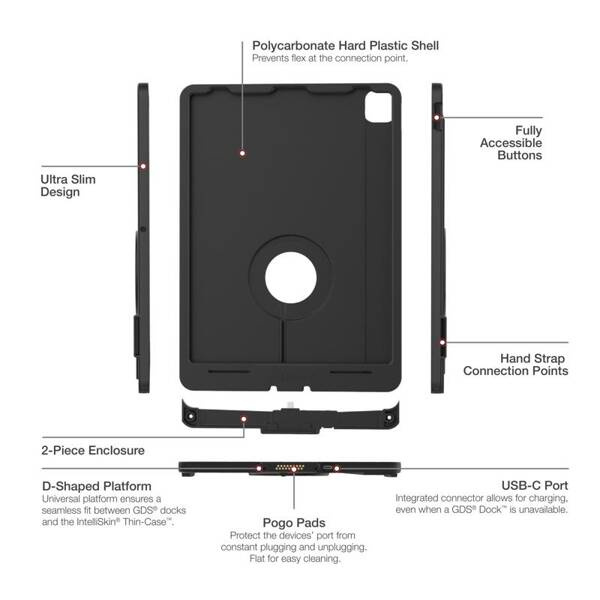 - Two-piece, hard plastic enclosure for Apple iPad Pro 12.9 (3rd-6th Gen) with integrated GDS® connector and pogo pads