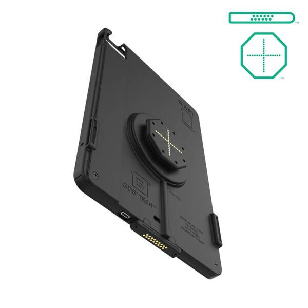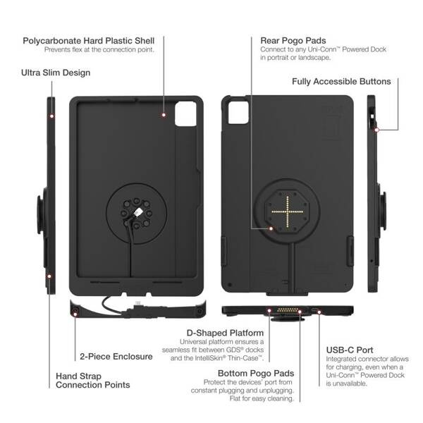 - Two-piece, hard plastic enclosure for Apple iPad Pro 11" (M2 & M3) with dual integrated GDS® connectors—rear pogo pads and Dinstinctive D Shape pogo pads