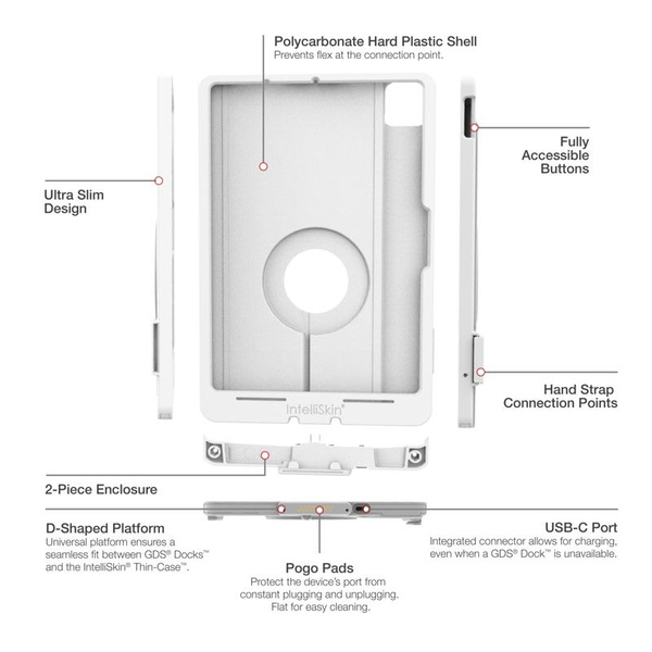 - Two-piece, hard plastic enclosure for Apple iPad Pro 11" (M4) with integrated GDS® connector and pogo pads