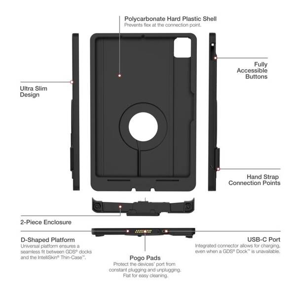 - Two-piece, hard plastic enclosure for Apple iPad Pro 11" (M4) with integrated GDS® connector and pogo pads