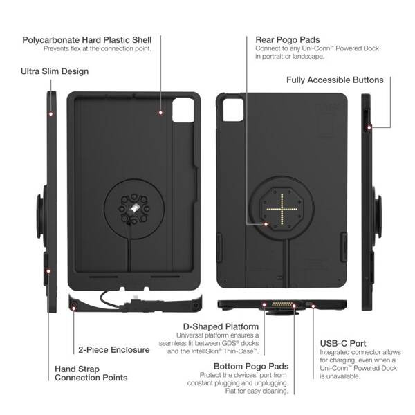 - Two-piece, hard plastic enclosure for Apple iPad Pro 11" (M4) with dual integrated GDS® connector—rear pogo pads and Dinstinctive D Shape pogo pads