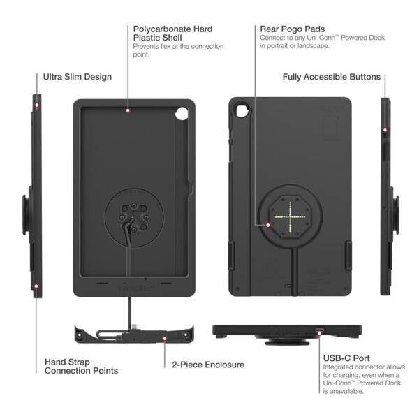 - Two-piece, hard plastic enclosure for Samsung A9+ with integrated GDS® Uni-Conn™ adapter with rear pogo pads