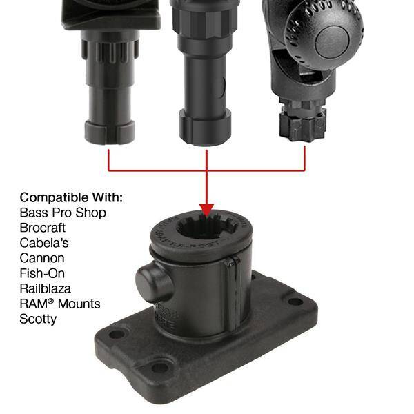 Универсальная база, совместимая с системами крепления RAM® Mounts, Scotty, Fish-On, Railblaza, Cannon, Brocraft, Cabela's и Bass Pro Shops.