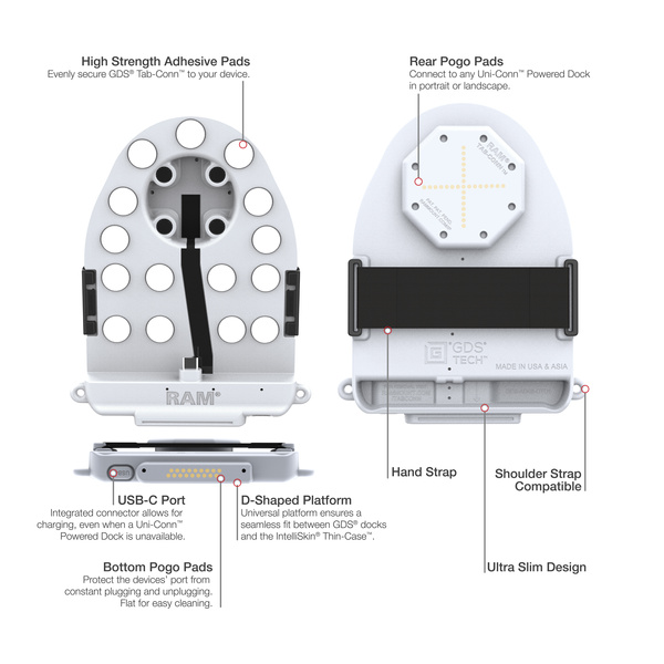 - Hard plastic, adhesive GDS® Uni-Conn™ adapter for bare tablets— features rear pogo pads and Dinstinctive D Shape™ connector
