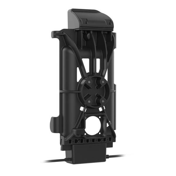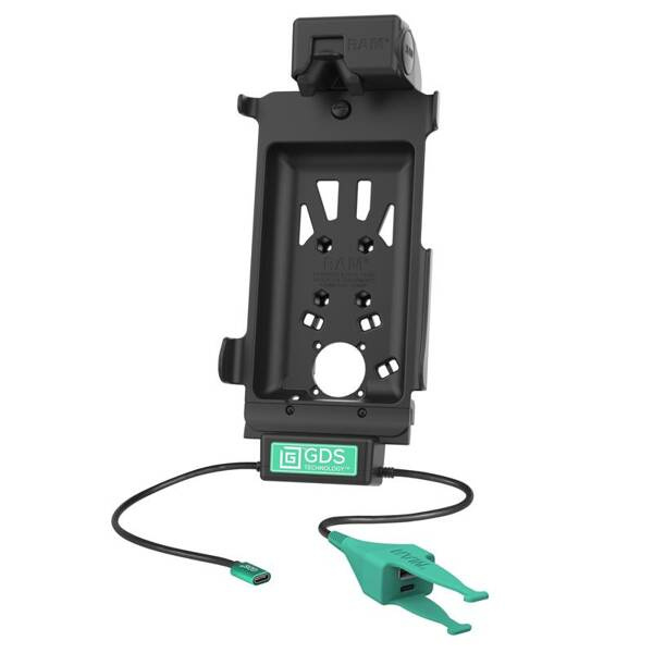 - Подпружиненная автомобильная док-станция с технологией GDS® Technology™ использует встроенный штыревой разъем pogo pin для зарядки и подключения двух дополнительных периферийных устройств USB.