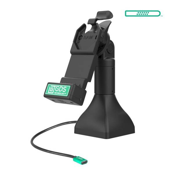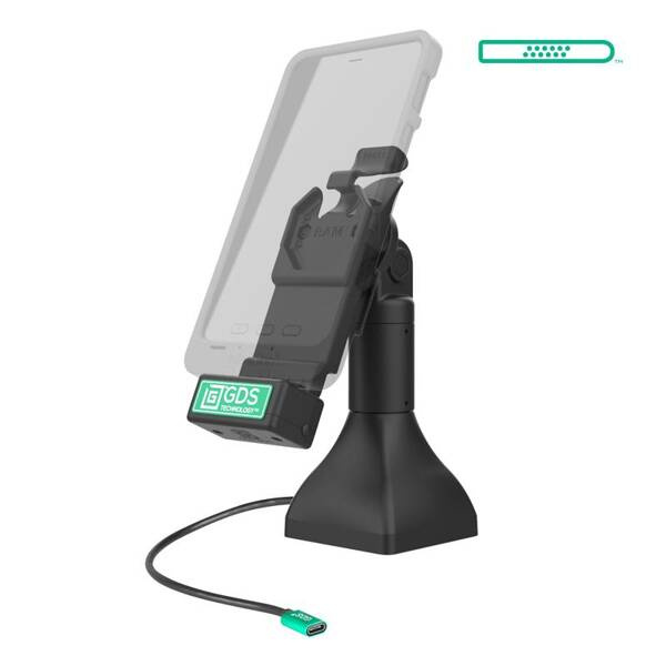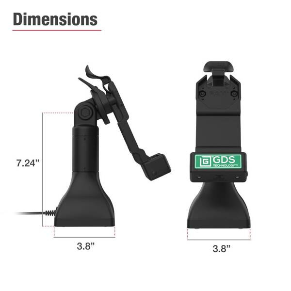 - 7" pedestal dock for devices enclosed in an IntelliSkin® with D-shaped bottom connection and GDS® Uni-Conn™ Adapter