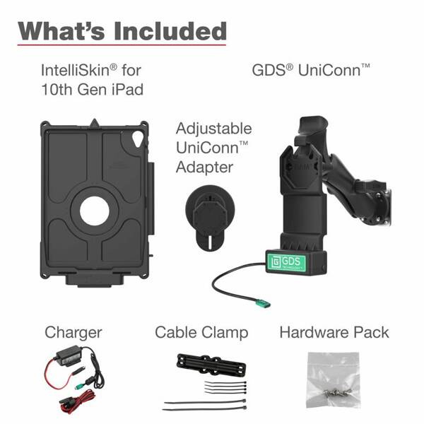 - Bundle includes the GDS® Uni-Conn™ dock, Uni-Conn™ adjustable adapter, IntelliSkin® Next Gen for Apple iPad 10th Gen, C size double ball mount with short arm, backing plate adapter, and cable clamp