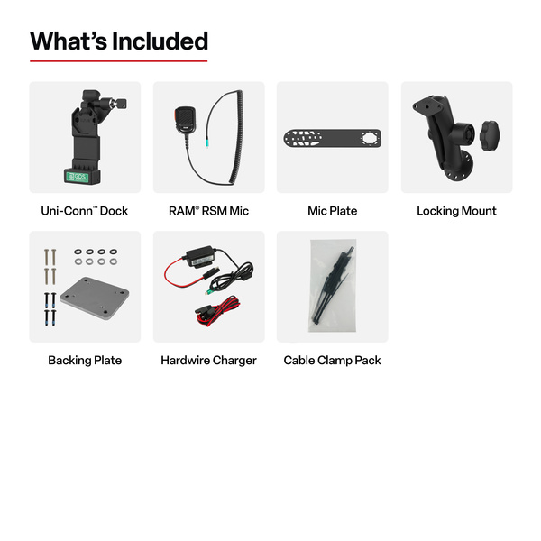 (1) Remote Speaker Mic (1) Uni-Conn™ Dock (Locking) (1) Mic Bracket (1) Mic Clip Receiver (1) Double Ball Mount with Backing Plate (1) Hardwire Charger (2) Cable Clamp Kits