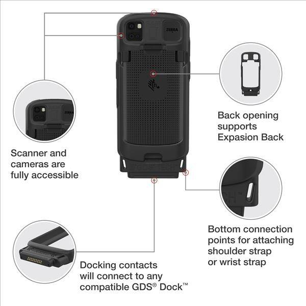 - Защитный чехол изготовлен из мягкой, амортизирующей резины с дополнительным вырезом для сканера; разработан специально для сканеров Zebra TC53/58.