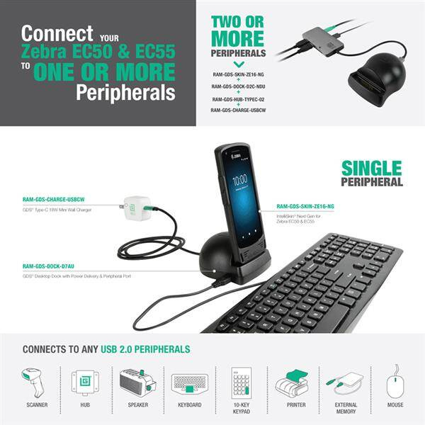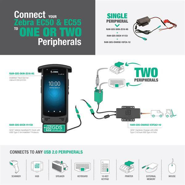 - Разъем GDS® и стыковочные штыри обеспечивают зарядку и синхронизацию данных на платформе GDS® Ecosystem™; устройства Zebra EC5x соответствуют спецификациям зарядки USB 3.1.