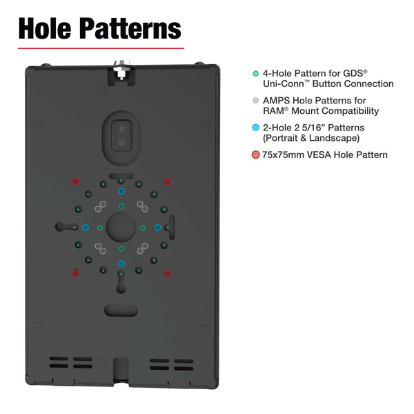• Secure to RAM® ball mounts with VESA and AMPS pattern; or flush mount