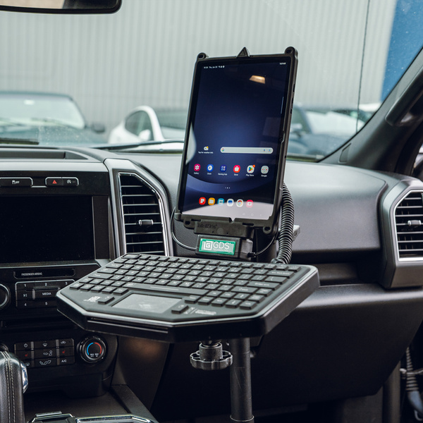 - Шарнирное крепление нижнего поворотного кронштейна позволяет поворачиваться на 360 градусов для идеального размещения клавиатуры GDS® Keyboard™.