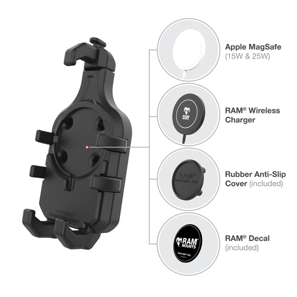 RAM Quick-Grip Pro Phone Mount with Motorcycle Fork Stem Base (RAM-B-176-A-PD5U) крепится к цилиндрической стенке отверстия штока вилки и представляет собой следующую эволюцию серии RAM Quick-Grip. Держатель телефона имеет новый, элегантный дизайн и интегрированные резиновые боковые рычаги, обеспечивающие надежную, не скользящую фиксацию телефона. В нем также имеется встроенная полость для шайбы Apple MagSafe, позволяющая превратить держатель телефона в беспроводную зарядку. Не хотите заряжаться? Нет проблем! Входящая в комплект противоскользящая крышка обеспечивает плотное прилегание, когда шайба Apple MagSafe не установлена. RAM Quick-Grip Pro имеет подпружиненную конструкцию, которая позволяет легко вставлять и вынимать телефон одной рукой. Регулируемые боковые рычаги обеспечивают надежную фиксацию телефона в держателе, не блокируя порты и кнопки. Входящее в комплект основание для штока мотоциклетной вилки подходит к цилиндрической стенке отверстия штока вилки диаметром от 12 до 38 мм (.5-1.49). RAM рекомендует устанавливать прилагаемую привязь устройства, если этот держатель используется в автомобиле с открытой кабиной. При определении габаритных размеров важно проверить размеры вашего портативного устройства вместе с чехлом, футляром или кожей. БрендСимволRAM-B-176-A-PD5UКод производителя793442026652СерияВес изделия454 gОборудование включеноМонтажные принадлежности|(1) Расширительная пробка для отверстий в штоке вилки 12 мм - 38 мм|(1) Машинный винт M5 x 60 мм|(1) Набор стальных шайб|(1) Набор гаечных шайб|(1) Латунная гайка NylockРазмеры рукояткиHeight Range: 5.5" - 7.75"|Width Range: 2.625" - 3.75"|Max Depth: .67"Длина от розетки до розетки1.75"Размер шараРазмер B (1")ЕмкостьСтандартное использование: 907,18 грамм|Твердое использование: 453,59 граммМатериалыАлюминий, морской классВысокопрочный композитТип упаковкиПластиковый пакетАвтомобильAprilia RS 660Aprilia RS 660 ExtremaAprilia RSV4 1100Aprilia RSV4 1100 FactoryAprilia RSV4 APRC ABS SBK SEAprilia RSV4 Factory APRCAprilia RSV4 RAprilia RSV4 R APRCAprilia RSV4 RFAprilia RSV4 RRAprilia RSV4 RR MisanoAprilia Tuono V4 1100Aprilia Tuono V4 1100 FactoryAprilia Tuono V4 1100 RRAprilia Tuono V4 1100 RR MisanoAprilia Tuono V4 RAprilia Tuono V4 R APRCprilia RSV4BMW F650BMW F800RBMW HP4 RaceBMW M1000RBMW M1000RRBMW R nineT RacerBMW S1000RRCFMOTO 300SSDucati 848Ducati 1199 PanigaleDucati 1199 Panigale RDucati 1199 Panigale SDucati 1199 Panigale S TricoloreDucati 1199 SuperleggeraDucati 1299 PanigaleDucati 1299 Panigale R Final EditionDucati 1299 Panigale SDucati 1299 SuperleggeraDucati 899 PanigaleDucati 959 PanigaleDucati 959 Panigale CorseDucati Panigale V2Ducati Panigale V2 BaylissDucati Panigale V4Ducati Panigale V4 RDucati Panigale V4 SDucati Panigale V4 S CorseDucati Panigale V4 SPDucati Panigale V4 SP2Ducati Superleggera V4Honda CBR250RHonda CBR250R ABSHonda VFR1200Honda VFR1200 DCTHonda VFR1200X ABSHonda VFR1200X DCT ABSKawasaki Ninja H2Kawasaki Ninja H2 SXKawasaki Ninja H2 SX SEKawasaki Ninja H2 SX SE PlusKawasaki Ninja H2RKawasaki Ninja ZX-14Kawasaki Ninja ZX-14RKawasaki Ninja ZX-14R ABSKawasaki Ninja ZX-14RRSuzuki GSX-R1000Suzuki GSX-R1000RSuzuki GSX-R1000RZSuzuki GSX-R600Suzuki GSX-R600ZSuzuki GSX-R750Suzuki GSX-R750ZSuzuki HayabusaSuzuki Hayabusa GSX1300RTriumph Daytona Moto2 765Triumph Speed Triple 765 Moto 2Triumph Street Triple 765 Moto 2Triumph Street Triple 765 RTriumph Street Triple 765 RSTriumph Street Triple 765 SYamaha MT-10Yamaha MT-10 SPYamaha R1Yamaha R1 LEYamaha R1 World GPYamaha R1MYamaha R1SYamaha R6Yamaha R6 GYTRYamaha R6 World GPYamaha R6SYamaha XV1900 Star EluderКомпонентыRAM-B-201U-ARAM-B-342URAM-HOL-PD5BUСовместимостьApple iPhone 6s PlusApple iPhone 8 PlusApple iPhone XApple iPhone XrApple iPhone XsApple iPhone Xs MaxApple iPhone 11Apple iPhone 11 ProApple iPhone 11 Pro MaxApple iPhone 12Apple iPhone 12 ProApple iPhone 12 Pro MaxApple iPhone 13Apple iPhone 13 ProApple iPhone 13 Pro MaxApple iPhone 14Apple iPhone 14 PlusApple iPhone 14 ProApple iPhone 14 Pro MaxApple iPhone 15Apple iPhone 15 PlusApple iPhone 15 ProApple iPhone 15 Pro MaxApple iPhone 16Apple iPhone 16 PlusApple iPhone 16 ProApple iPhone 16 Pro MaxApple iPhone 16eBlackberry Evolve XBlackview BV9900Blackview BV9900 ProGoogle Pixel 2Google Pixel 2 XLGoogle Pixel 3Google Pixel 3 XLGoogle Pixel 3aGoogle Pixel 3a XLGoogle Pixel 4Google Pixel 4 XLGoogle Pixel 4aGoogle Pixel 5Google Pixel 6Google Pixel 6 ProGoogle Pixel 7Google Pixel 7 ProGoogle Pixel 8Google Pixel 8 ProHTC U11Huawei Mate 20 ProHuawei Mate 20 XHuawei P30 ProLG Aristo 2LG Fiesta 2 LTELG Fiesta LTELG G6LG G6+LG G7 ThinQLG G8 ThinQLG G8S ThinQLG